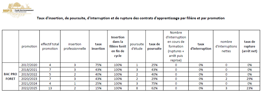 Chaque année, La MFR Forêt-environnement accueille 65 à 80 jeunes (sous le statut d’élève ou d’apprenti). L’effectif moyen est de 15 à 20 jeunes par groupe. Toutes les formations dispensées s’effectuent par alternance (stagiaire ou salarié) que l’on soit en formation scolaire ou en formation par apprentissage. Elle forme également en fonction des opportunités des adultes dans le cadre de la formation continue. La maison possède aujourd’hui 30 ans d’expérience dans la formation forestière. Son taux moyen de réussite à l’examen du BAC Pro forêt sur 5 ans est supérieur à 85%.